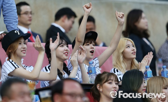 (서울=포커스뉴스) 31일 서울 잠실구장에서 열린 2016 프로야구 KIA-LG 경기에서 인기 걸그룹 트와이스멤버들이 중앙 관중석에서 경기를 즐기고 있다.