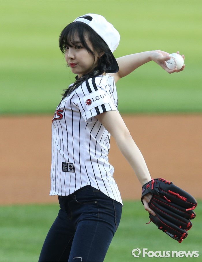 (서울=포커스뉴스) 31일 서울 잠실구장에서 열린 2016 프로야구 KIA-LG 경기에 앞서 걸그룹 트와이스의 나연이 시구하고 있다.