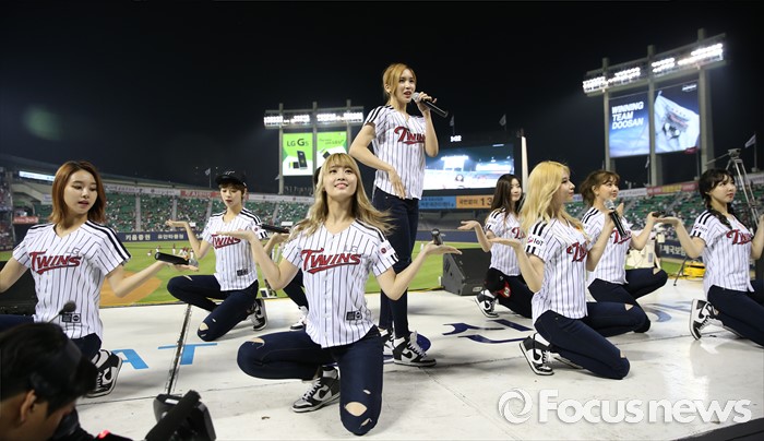 (서울=포커스뉴스) 31일 서울 잠실구장에서 열린 2016 프로야구 KIA-LG 경기에 인기 걸그룹 트와이스가 시구, 시타로 참여한뒤 경기 중간 응원단상에 올라 관중에게 노래와 춤을 선사하고 있다.