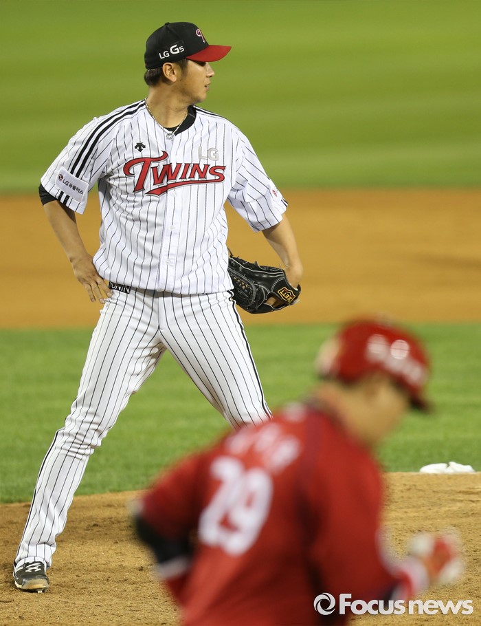(서울=포커스뉴스) 31일 서울 잠실구장에서 열린 2016 프로야구 KIA-LG 경기 6회초 2사 만루에서 LG 투수 신승현이 KIA 나지완에게 밀어내기 볼넷을 내주고 아쉬워하고 있다.