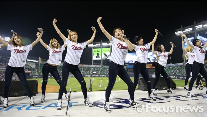 (서울=포커스뉴스) 31일 서울 잠실구장에서 열린 2016 프로야구 KIA-LG 경기에 인기 걸그룹 트와이스가 시구, 시타로 참여한뒤 경기 중간 응원단상에 올라 관중에게 노래와 춤을 선사하고 있다.