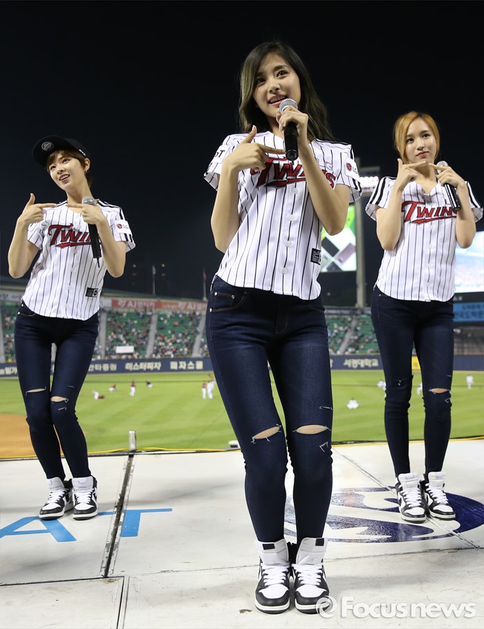 (서울=포커스뉴스) 31일 서울 잠실구장에서 열린 2016 프로야구 KIA-LG 경기에 인기 걸그룹 트와이스가 시구, 시타로 참여한뒤 경기 중간 응원단상에 올라 관중에게 노래와 춤을 선사하고 있다.