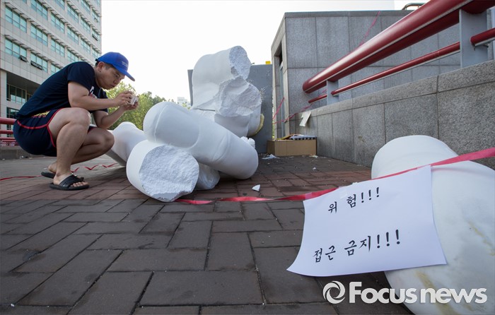 (서울=포커스뉴스) 1일 오전 서울 마포구 홍익대학교 정문에 설치된 극우성향 사이트 '일베' 상징물 조각상 파손된 채 길에 방치돼 있다. 조각상은 일간베스트저장소를 상징하는 자음 'ㅇ'과 'ㅂ' 모양을 하며 회원을 인증하는 손 모양이다. '어디에나 있고, 아무데도 없다'는 제목의 이 조각상은 조소과 4학년 홍기하씨가 '환경조각연구' 수업 과제로 제작해 야외조각전에 출품한 것이다.