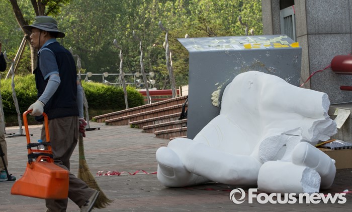 (서울=포커스뉴스) 1일 오전 서울 마포구 홍익대학교 정문에 설치된 극우성향 사이트 '일베' 상징물 조각상 파손된 채 길에 방치돼 있다. 조각상은 일간베스트저장소를 상징하는 자음 'ㅇ'과 'ㅂ' 모양을 하며 회원을 인증하는 손 모양이다. '어디에나 있고, 아무데도 없다'는 제목의 이 조각상은 조소과 4학년 홍기하씨가 '환경조각연구' 수업 과제로 제작해 야외조각전에 출품한 것이다.