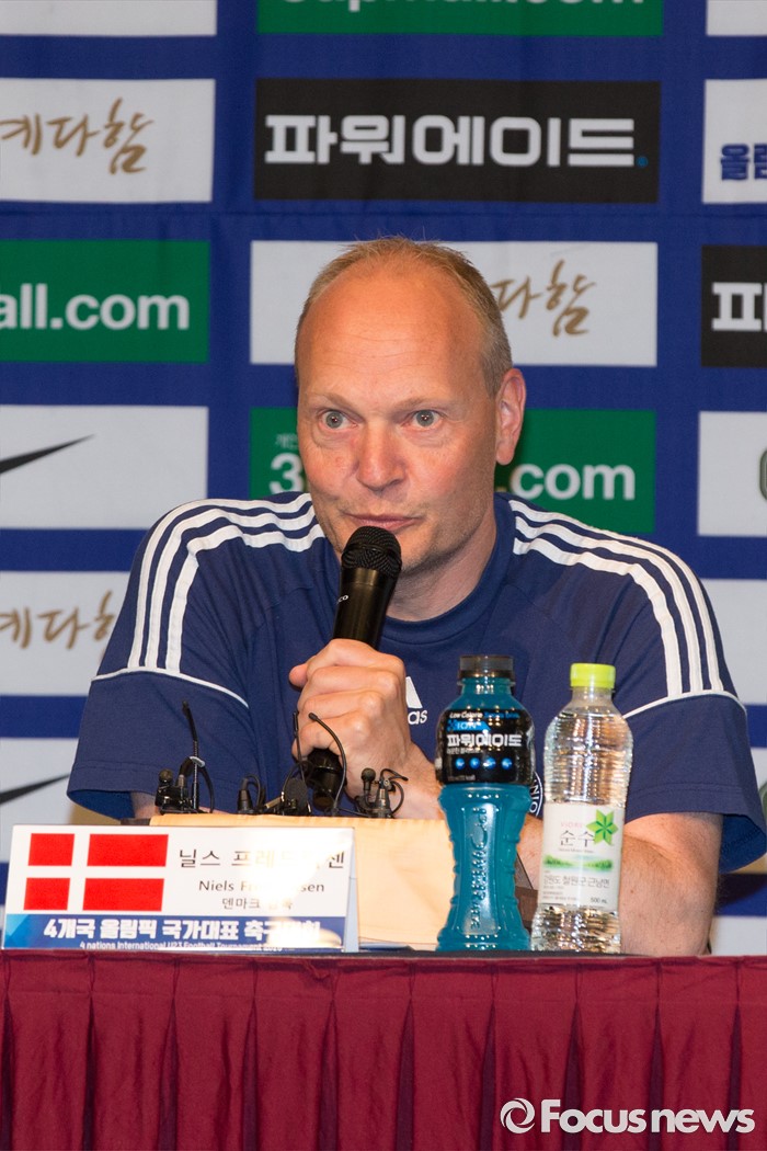 (인천=포커스뉴스) 1일 오전 인천 연수구 라마다송도호텔에서 열린 4개국 올림픽 국가대표 축구대회 공식 기자회견에 참가한 닐스 프레드닉센 덴마크 감독이 취재진 질문에 답하고 있다.