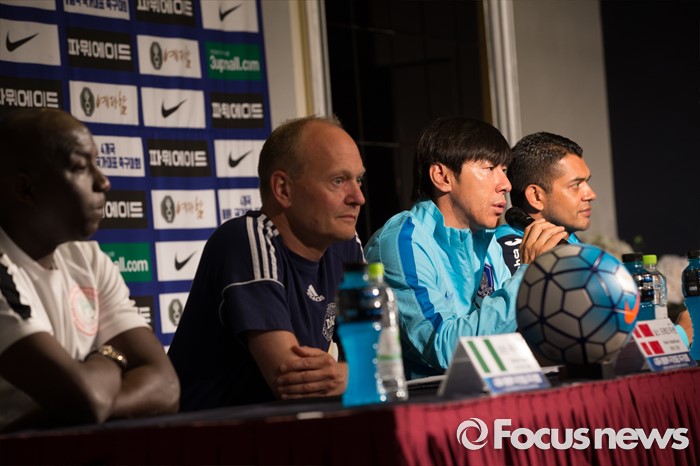 (인천=포커스뉴스) 1일 오전 인천 연수구 라마다송도호텔에서 열린 4개국 올림픽 국가대표 축구대회 공식 기자회견에서 신태용 대한민국 감독이 질문에 답하고 있다. 왼쪽부터 삼손 시아시아 나이지리아 감독, 닐스 프레드닉센 덴마크 감독, 신 감독, 아마도 궤바라 온두라스 수석코치.