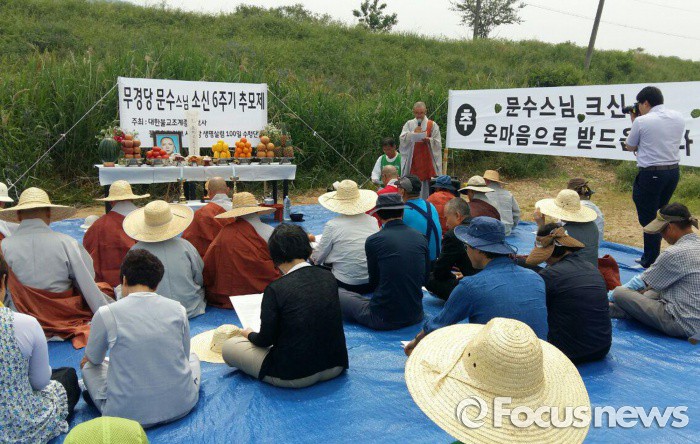 (군위=포커스뉴스) 59일째 사대강 걷기를 하고 있는 불교환경연대(상임대표 법일스님) 소속 스님과 불자 50 여명이 31일 오후 경북 군위읍 못골 잠수교에서 6년 전 , 사대강 토목사업 반대운동을 하다가 소신한 문수스님 추모제를 갖고 있다. <사진제공=불교환경연대>