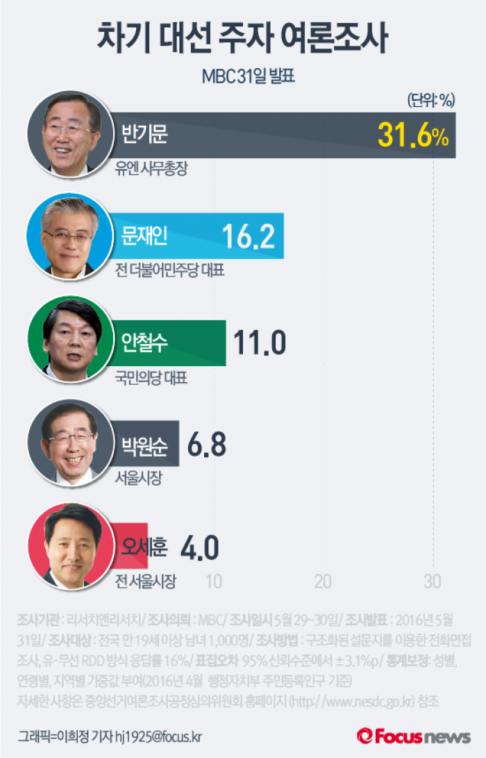 (서울=포커스뉴스) MBC가 의뢰, 리서치앤리서치가 조사해 31일 발표한 여론조사 결과에 따르면 1위인 반 총장의 지지율은 31.6%로 2위 문재인 더불어민주당 전 대표(16.2%)보다 큰 폭으로 앞섰다.
