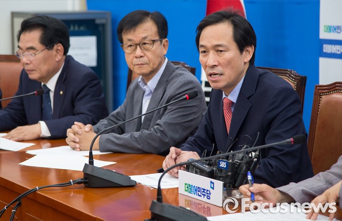(서울=포커스뉴스) 우상호(오른쪽) 더불어민주당 원내대표가 1일 오전 서울 여의도 국회 원내대표실에서 열린 서민주거TF 발족식에서 인사말을 하고 있다.