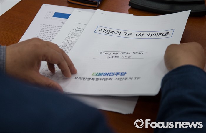 (서울=포커스뉴스) 1일 오전 서울 여의도 국회 더불어민주당 원내대표실에서 열린 서민주거TF 발족식에서 서민 주거 관련 회의자료가 보이고 있다.