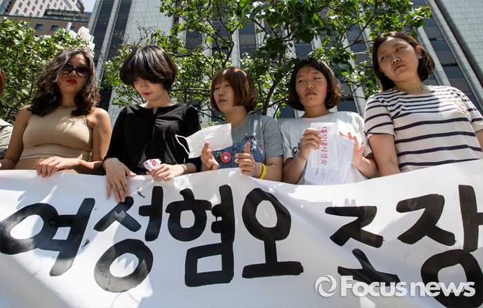(서울=포커스뉴스) 1일 오전 서울 중구 프레스센터 앞에서 '언론의 여성혐오 조장 보도실태'에 반대하는 20대 여성들이 '우리는 기자회견女다' 기자회견을 갖고 있다.