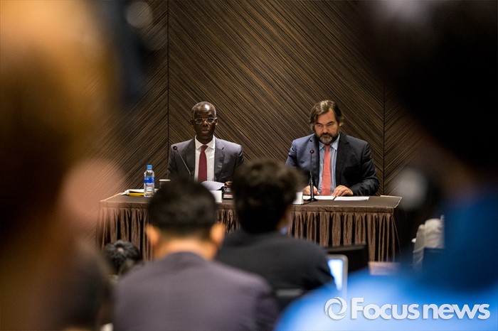 (서울=포커스뉴스) 1일 오후 서울 중구 플라자호텔에서 열린 '유엔인권이사회, 기업과인권 한국조사단 기자회견'에서 마이클(왼쪽) 아도 의원이 한국 기업 인권 조사 결과 발표를 하고 있다.