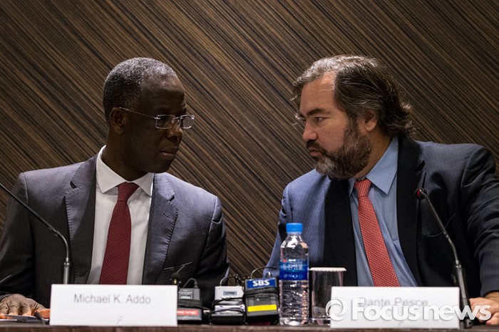 (서울=포커스뉴스) 1일 오후 서울 중구 플라자호텔에서 열린 '유엔인권이사회, 기업과인권 한국조사단 기자회견'에서 단테 페스케(오른쪽) 의장과 마이클 아도 의원이 한국 기업 인권 조사 결과 발표에 앞서 대화를 나누고 있다.
