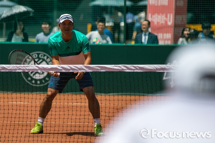 (서울=포커스뉴스) 이형택 전 테니스 국가대표가 1일 오후 서울 중구 서울광장에서 열린 '롤랑가로스(프랑스오픈) 인더시티'에서 대학생들과 스페셜 매치 시합을 하고 있다.