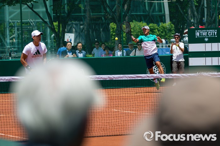 (서울=포커스뉴스) 이형택 전 테니스 국가대표가 1일 오후 서울 중구 서울광장에서 열린 '롤랑가로스(프랑스오픈) 인더시티'에서 대학생들과 스페셜 매치 시합을 하고 있다.