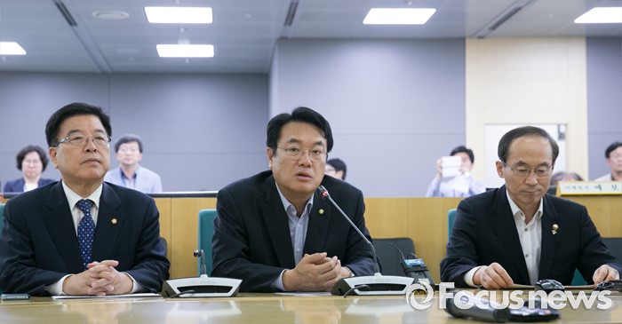 (서울=포커스뉴스) 미세먼지 대책과 관련해 현장 방문에 나선 정진석 새누리당 원내대표가 1일 오후 서울 동작구 기상청 종합상황실을 방문해 모두발언을 하고 있다. 왼쪽부터 김광림 정책위의장, 정 원내대표, 윤성규 환경부 장관.