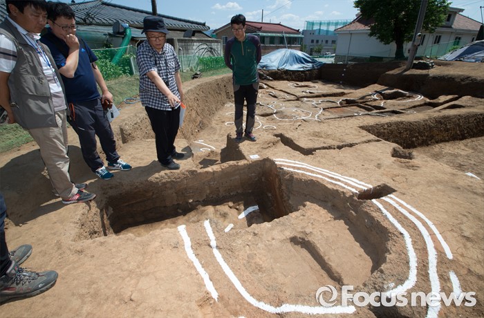 (충주=포커스뉴스) 충북 충주 칠금동 392-5번지 일대에서 백제 제철유적이 발견된 가운데 2일 현장에서 발굴조사 현장설명회가 열렸다. 학계관계자들이 제철유적을 살피고 있다.