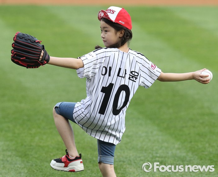 (서울=포커스뉴스) 1일 서울 잠실구장에서 열린 2016 프로야구 KIA-LG 경기에 앞서 TV 드라마 '내딸 금사월'에 출연했던 아역배우 이나윤 어린이가 시구하고 있다.