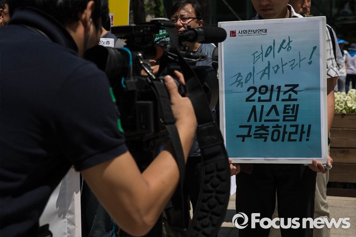 (서울=포커스뉴스) 2일 오전 서울 중구 서울시청 정문 앞에서 '서울시 지하철 하청노동자 사망재해 해결을 위한 시민대책위원회(가칭)'가 지하철 2호선 구의역 사고에 대한 책임자 처벌과 대책마련을 촉구하며 기자회견을 하고 있다.