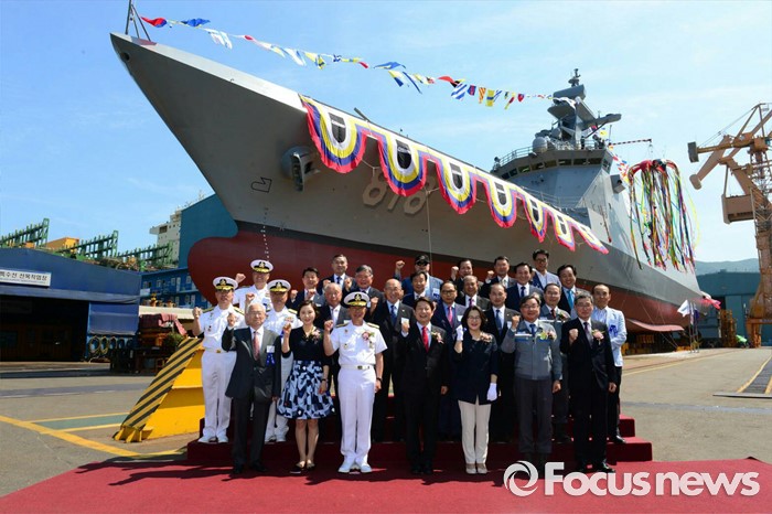(서울=포커스뉴스) 2일 오후 경남 거제 대우조선해양에서 열린 대구함 진수식에서 관계자들이 기념사진을 찍고 있다. 전투함 최초로 하이브리드 추진체계를 적용한 해군의 신형 호위함(FFG-Ⅱ, 2800톤급)인 대구함은 대공 · 대함 · 대잠 · 대지전까지 수행할 수 있다. <사진제공= 해군>