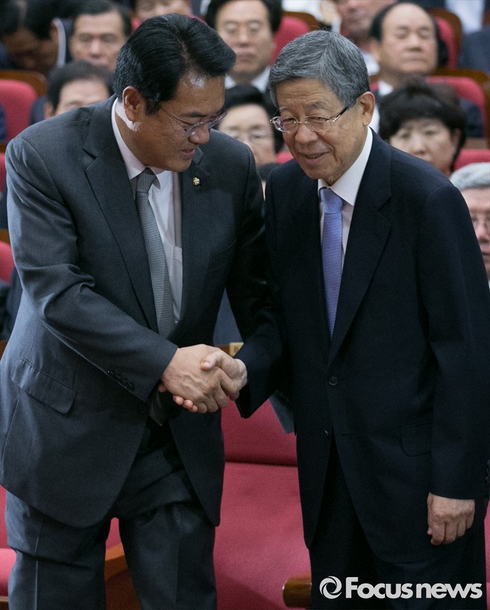 (서울=포커스뉴스) 2일 오후 서울 여의도 국회 의원회관에서 열린 새누리당 4차 전국위원회에 참석한 정진석(왼쪽) 원내대표와 공식 선출된 김희옥 혁신비대위원장이 악수하고 있다.