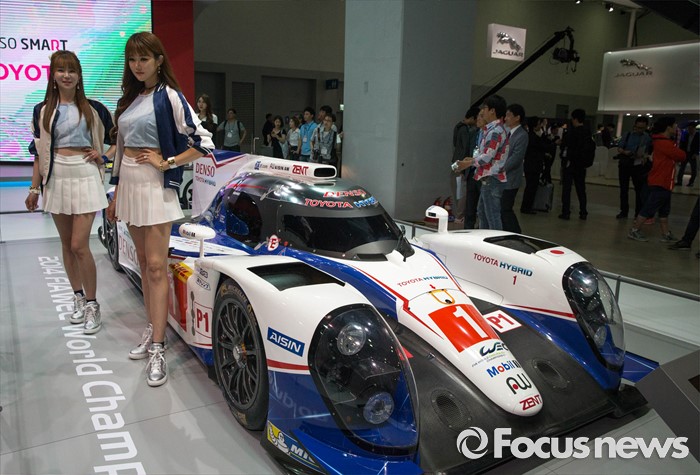 (부산=포커스뉴스) 2일 오전 부산 해운대구에 위치한 벡스코에서 '2016 부산국제모터쇼'가 열린 가운데 도요타 부스의 레이싱걸들이 하이브리드 레이싱 머쉰 앞에서 포즈를 취하고 있다.