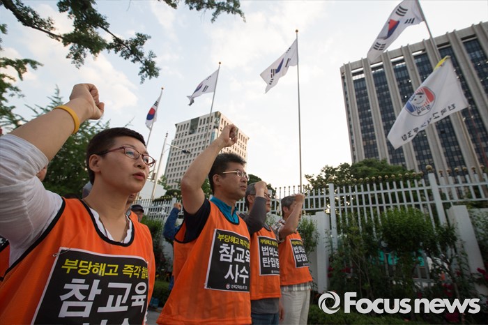 (서울=포커스뉴스) 전국교직원노동조합 조합원들이 1일 오후 서울 종로구 정부서울청사 앞에서 열린 '법외노조 탄압, 부당해고 규탄 48시간 집중행동 투쟁문화재'에서 부당해고 중단을 촉구하는 구호를 외치고 있다.