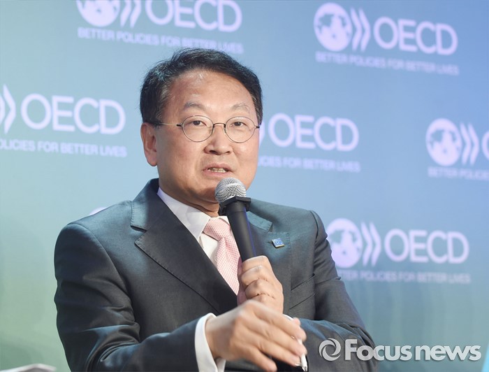 (서울=포커스뉴스) 유일호 부총리 겸 기획재정부 장관이 1일 프랑스 파리 OECD에서 열린 '2016년 OECD 각료이사회'에 참석, 고위급 패널토론에서 주제인 '성장을 위한 새로운 과제'와 관련 토론하고 있다. <사진제공=기획재정부>