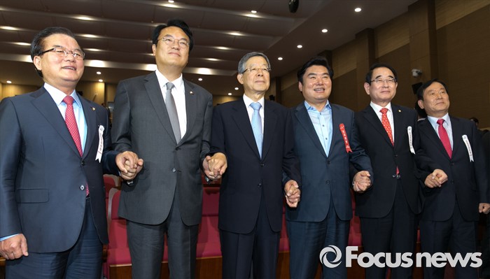 (서울=포커스뉴스) 2일 오후 서울 여의도 국회 의원회관에서 열린 새누리당 4차 전국위원회에 참석한 정진석 원내대표와 공식 선출된 김희옥 혁신비대위원장 등이 취재진을 향해 포즈를 취하고 있다. 왼쪽부터 정갑윤 신임 전국위의장, 정 원내대표, 김 위원장, 원유철 전 원내대표, 박명재, 전희재 신임 전국위부의장.