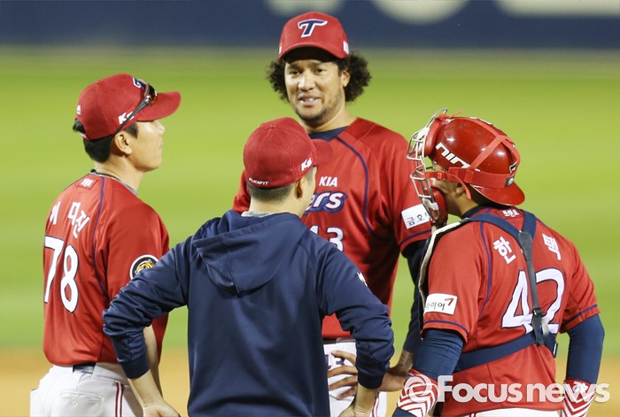 (서울=포커스뉴스) 1일 서울 잠실구장에서 열린 2016 프로야구 KIA-LG 경기 6회말 1사 1,2루에서 KIA 이대진 투수코치가 마운드에 올라가 투수 헥터와 대화하고 있다.