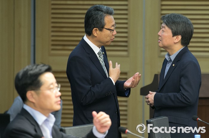 (서울=포커스뉴스) 2일 오전 서울 여의도 국회 의원회관에서 열린 국민의당 정책역량강화 집중 워크숍에 참석한 안철수(오른쪽) 상임공동대표와 김성식(가운데) 정책위의장이 대화하고 있다.