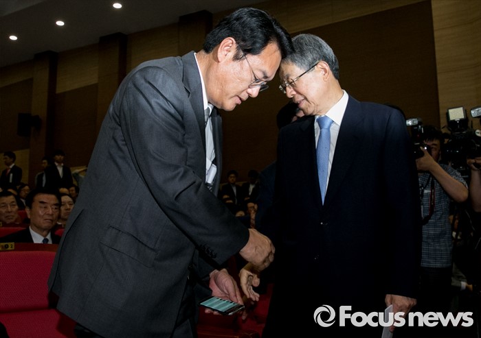 (서울=포커스뉴스) 2일 오후 서울 여의도 국회 의원회관에서 열린 새누리당 4차 전국위원회에 참석한 정진석(왼쪽) 원내대표와 공식 선출된 김희옥 혁신비대위원장이 악수하고 있다.