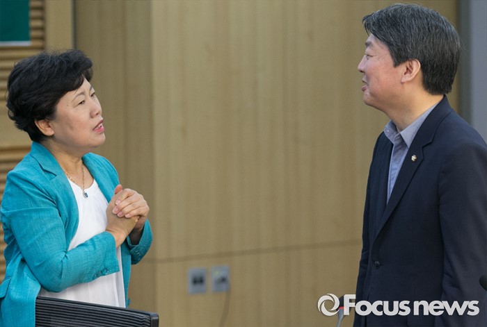 (서울=포커스뉴스) 2일 오전 서울 여의도 국회 의원회관에서 열린 국민의당 정책역량강화 집중 워크숍에 참석한 안철수(오른쪽) 상임공동대표와 조배숙 의원이 대화하고 있다.