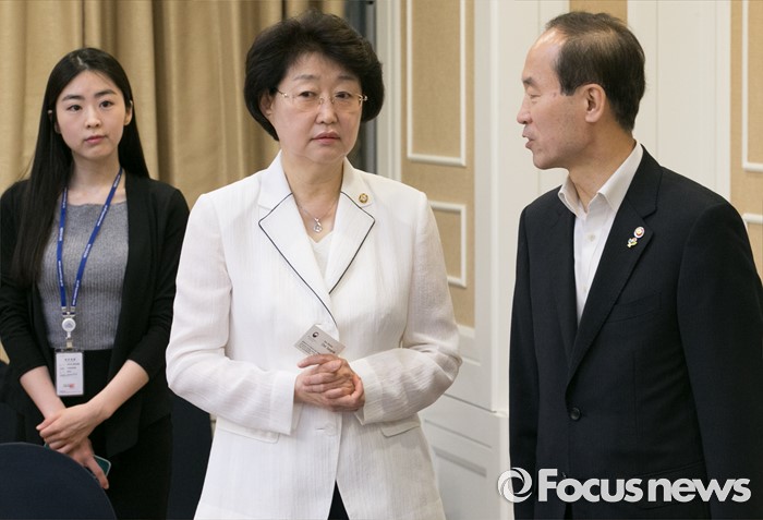 (서울=포커스뉴스) 2일 오전 서울 여의도 국회 귀빈식당에서 열린 미세먼지 대책 관련 당정협의에 참석한 윤성규(오른쪽) 환경부 장관과 김승희 새누리당 의원이 대화하고 있다.