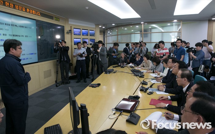 (서울=포커스뉴스) 미세먼지 대책과 관련해 현장 방문에 나선 정진석 새누리당 원내대표와 의원들이 1일 오후 서울 동작구 기상청 종합상황실을 방문해 관계자로부터 설명을 듣고 있다.