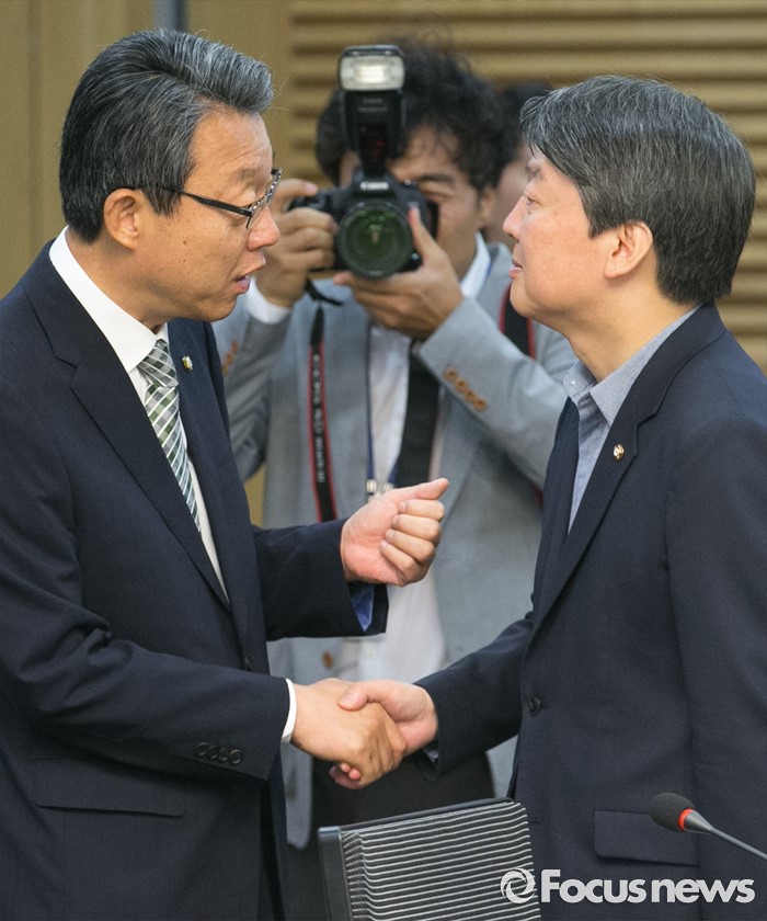 (서울=포커스뉴스) 2일 오전 서울 여의도 국회 의원회관에서 열린 국민의당 정책역량강화 집중 워크숍에 참석한 안철수(오른쪽) 상임공동대표와 김성식 정책위의장이 인사하고 있다.