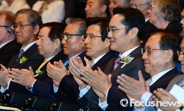 (서울=포커스뉴스) 1일 오후 서울 중구 호암아트홀에서 열린 제26회 호암상 시상식에 참석한 황교안(왼쪽 네번째 부터) 국무총리와 이재용 삼성전자 부회장이 박수치고 있다.
