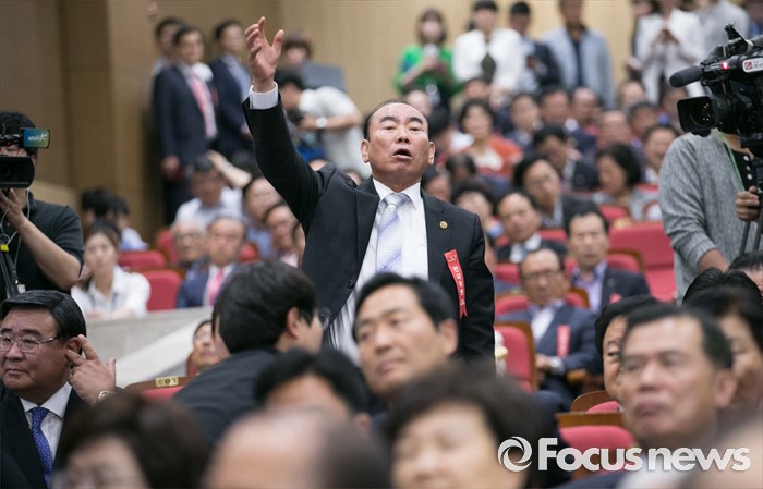 (서울=포커스뉴스) 2일 오후 서울 여의도 국회 의원회관에서 열린 새누리당 4차 전국위원회에 참석한 전국위원이 탈당 의원들의 복당 촉구 의견을 전하고 있다.