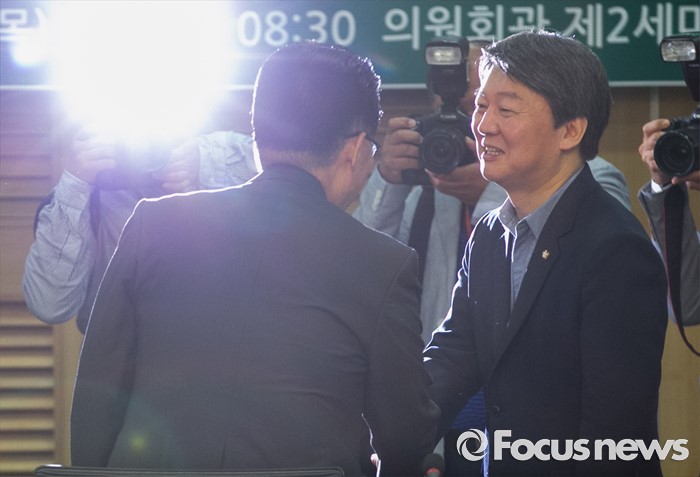 (서울=포커스뉴스) 2일 오전 서울 여의도 국회 의원회관에서 열린 국민의당 정책역량강화 집중 워크숍에 참석한 안철수(오른쪽) 상임공동대표와 박지원 원내대표가 인사하고 있다.
