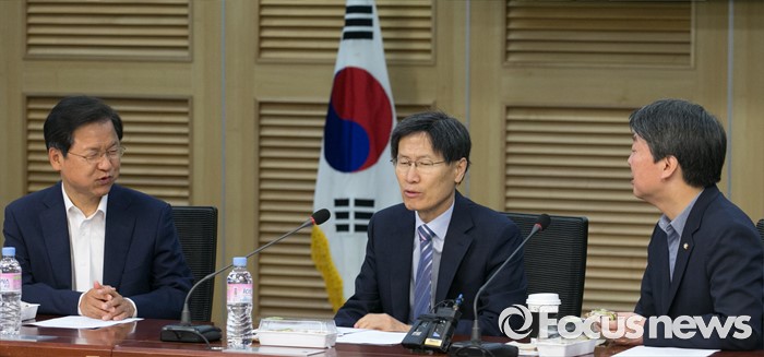 (서울=포커스뉴스) 2일 오전 서울 여의도 국회 의원회관에서 열린 국민의당 정책역량강화 집중 워크숍에 참석한 안철수(오른쪽) 상임공동대표, 천정배(왼쪽) 공동대표와 강연자로 나선 윤영관 전 외교통상부 장관이 대화하고 있다.