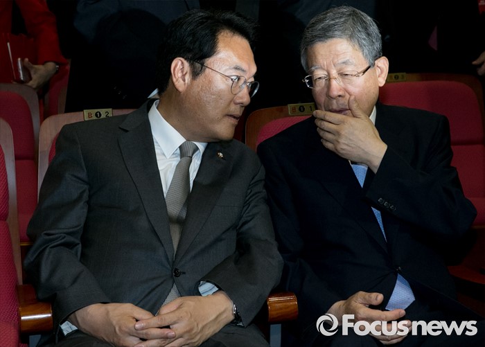 (서울=포커스뉴스) 2일 오후 서울 여의도 국회 의원회관에서 열린 새누리당 4차 전국위원회에 참석한 정진석(왼쪽) 원내대표와 공식 선출된 김희옥 혁신비대위원장이 대화하고 있다.