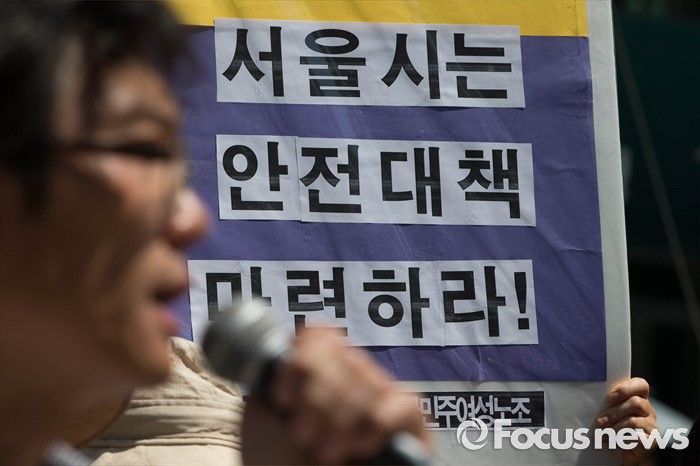 (서울=포커스뉴스) 2일 오전 서울 중구 서울시청 정문 앞에서 '서울시 지하철 하청노동자 사망재해 해결을 위한 시민대책위원회(가칭)'가 지하철 2호선 구의역 사고에 대한 책임자 처벌과 대책마련을 촉구하며 기자회견을 하고 있다.