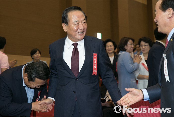 (서울=포커스뉴스) 2일 오후 서울 여의도 국회 의원회관에서 열린 새누리당 4차 전국위원회에 서청원 전 최고위원이 의원들과 인사하고 있다.