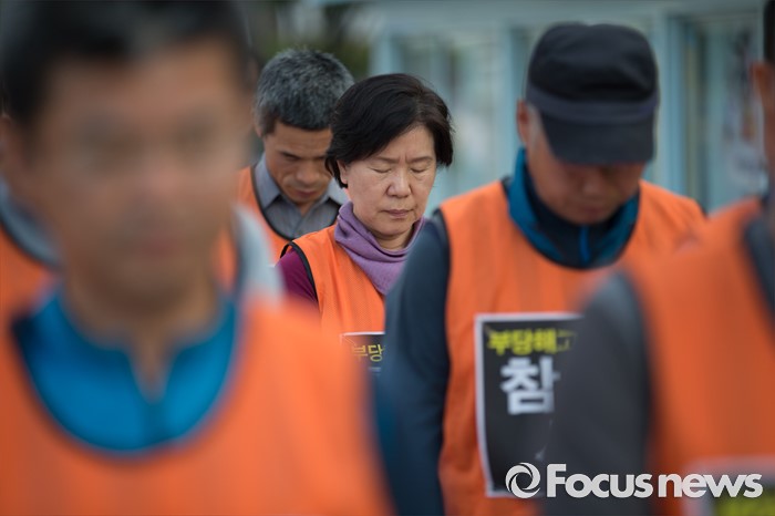 (서울=포커스뉴스) 전국교직원노동조합 조합원들이 1일 오후 서울 종로구 정부서울청사 앞에서 열린 '법외노조 탄압, 부당해고 규탄 48시간 집중행동 투쟁문화재'에서 민중의례 하고 있다.