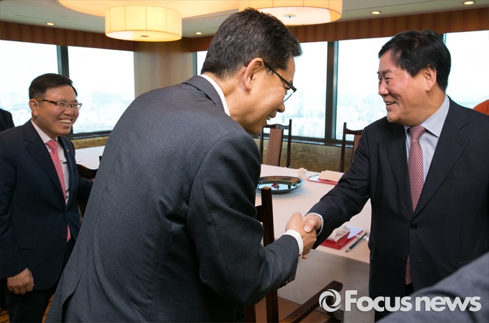 (서울=포커스뉴스) 최경환(오른쪽) 새누리당 의원이 2일 오후 서울 여의도 한 중식당에서 열린 20대 총선 대구지역 당선 의원들과의 오찬에 참석해 곽상도(가운데), 정태옥 의원과 인사하고 있다. 이날 오찬에는 곽대훈, 곽상도, 윤재옥, 정태옥, 추경호 의원 등이 참석했다.