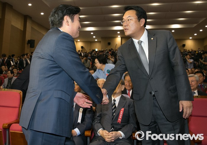 (서울=포커스뉴스) 2일 오후 서울 여의도 국회 의원회관에서 열린 새누리당 4차 전국위원회에 참석한 정진석(오른쪽) 원내대표와 원유철 전 원내대표가 인사하고 있다.