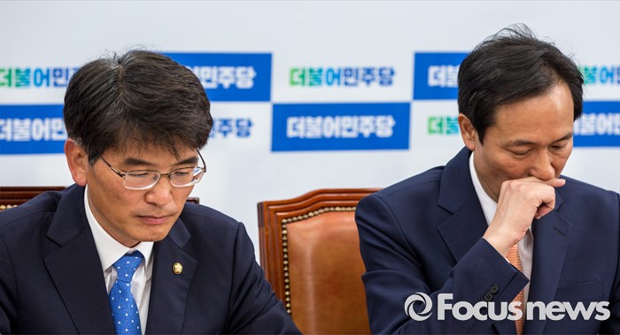 (서울=포커스뉴스) 우상호(오른쪽) 더불어민주당 원내대표와 박완주 원내수석부대표가 2일 오전 서울 여의도 국회에서 열린 정책조정회의에 참석하고 있다.