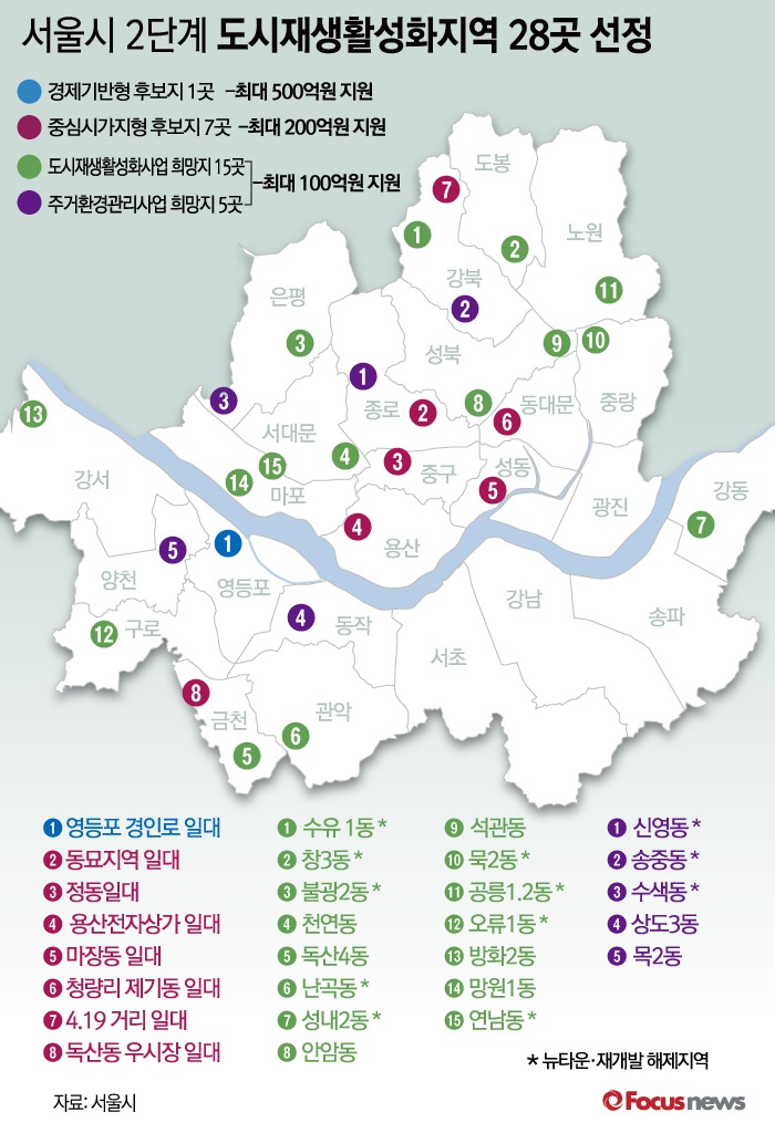 경제기반형 후보지 1곳은 영등포 경인로 지역(영등포구)이다. 또 중심시가지형 후보지 7곳은 △정동 일대(중구) △동묘지역 일대(종로구) △마장동 일대(성동구) △용산전자상가 일대(용산구) △독산동 우시장 부지(금천구) △청량리·제기동 일대(동대문구) △4.19사거리 일대(강북구)다.