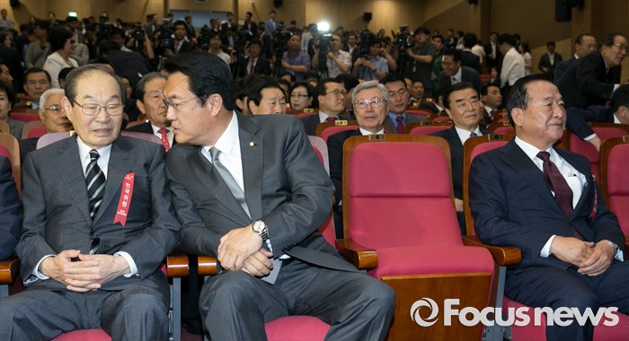 (서울=포커스뉴스) 2일 오후 서울 여의도 국회 의원회관에서 열린 새누리당 4차 전국위원회에 참석한 정진석(가운데) 원내대표와 정재철(왼쪽) 상임고문이 대화하고 있다. 오른쪽은 서청원 전 최고위원.