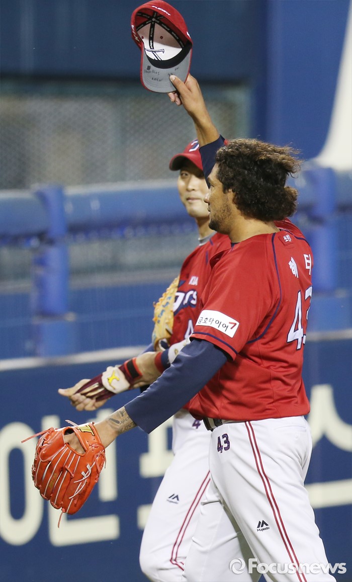 (서울=포커스뉴스) 1일 서울 잠실구장에서 열린 2016 프로야구 KIA-LG 경기에서 KIA 투수 헥터가 7회말 실점 위기를 넘기고 덕아웃으로 들어가며 관중들의 환호에 모자를 들어 답하고 있다.